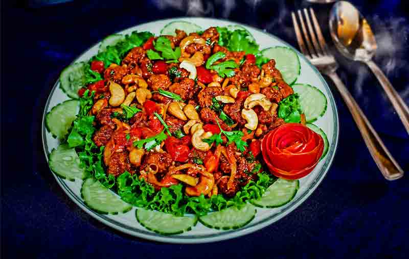 Warm fried cube cut chicken, roasted cashew nut, tomato, onion, coriander & spicy sauce