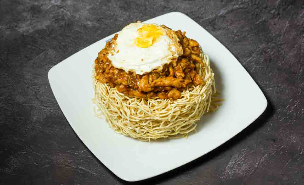 Crispy fried noodles serve with saucy sliced chicken & Julienne cut ve...