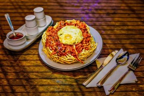 Crispy fried noodles topping with sliced chicken, prawn, vegetable & egg