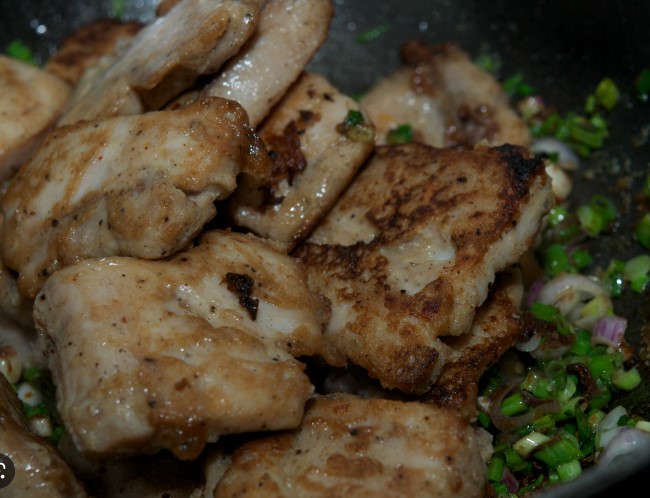 Sliced sea fish prepared with capsicum, onion, mushroom, & ginger