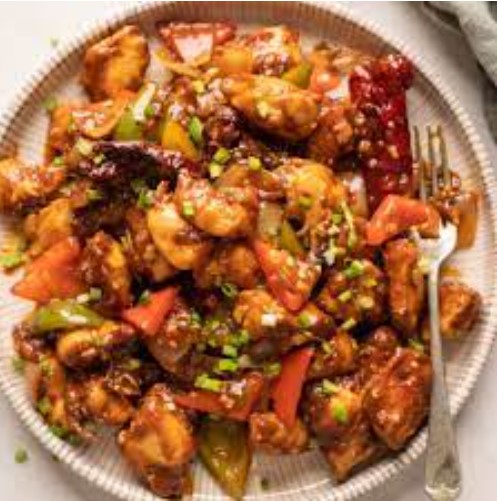 Sliced chicken glazed in high heat and cooked with red chili, capsicum...