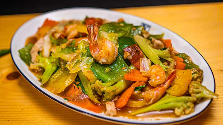 Seasonal mixed vegetable cooked with chicken slices & prawn